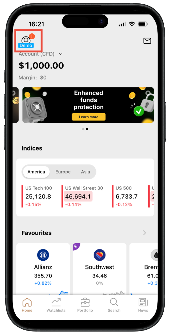 اختر حساب العرض التجريبي الذي تريد تعديله، ثم اضغط على "تعديل الرصيد".