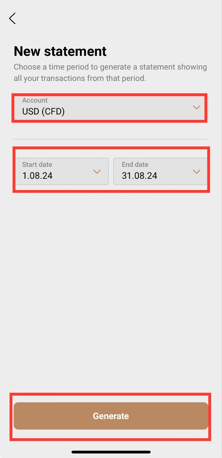 Nell'app, vai su ‘Account’ > ‘Estratti conto’ > ‘Nuovo estratto conto’, e seleziona il conto e l'intervallo di tempo rilevanti prima di cliccare su ‘Genera’.