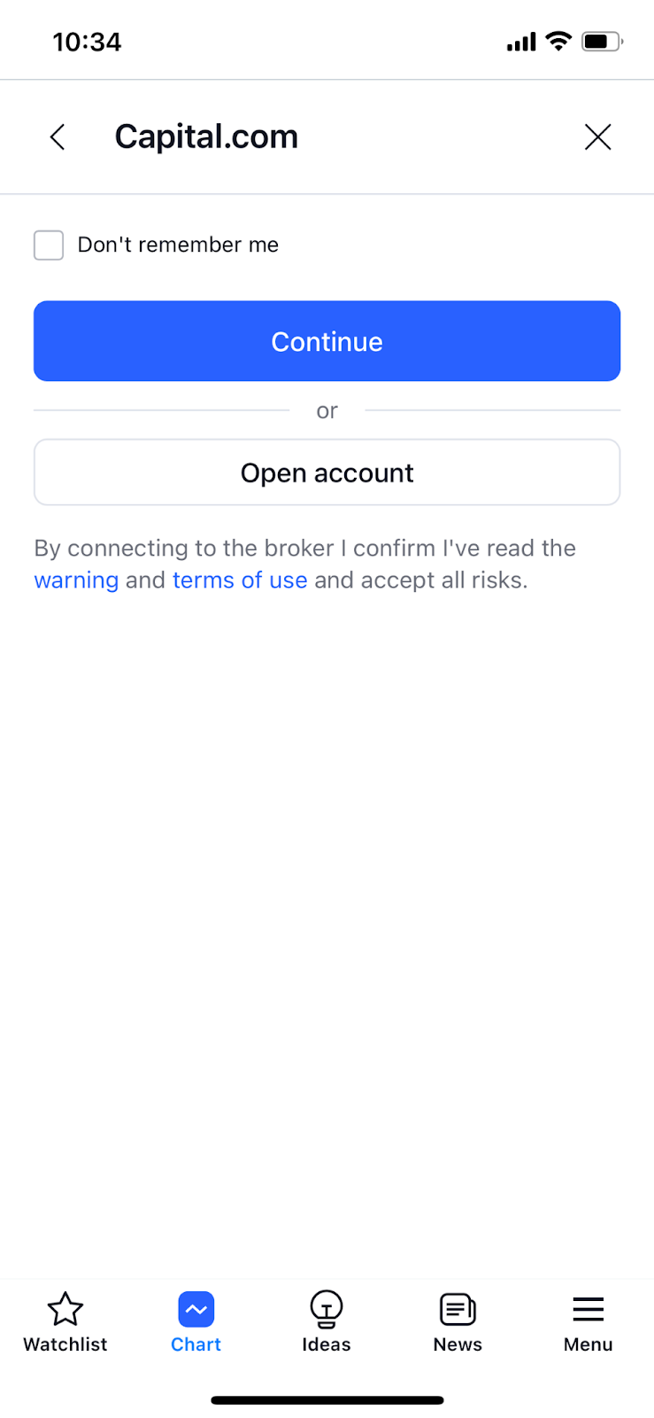 Clique no ícone de 3 pontos no canto inferior direito. Depois de fazer isso, você verá uma janela Mais. Nela, você deve clicar no bloco "Conectar corretora" e escolher a opção Capital.com. Na próxima tela, você pode clicar no botão "Continuar" e conectar a conta existente da plataforma Capital.com com o aplicativo TradingView ou abrir uma conta na Capital.com clicando no botão "Abrir conta".