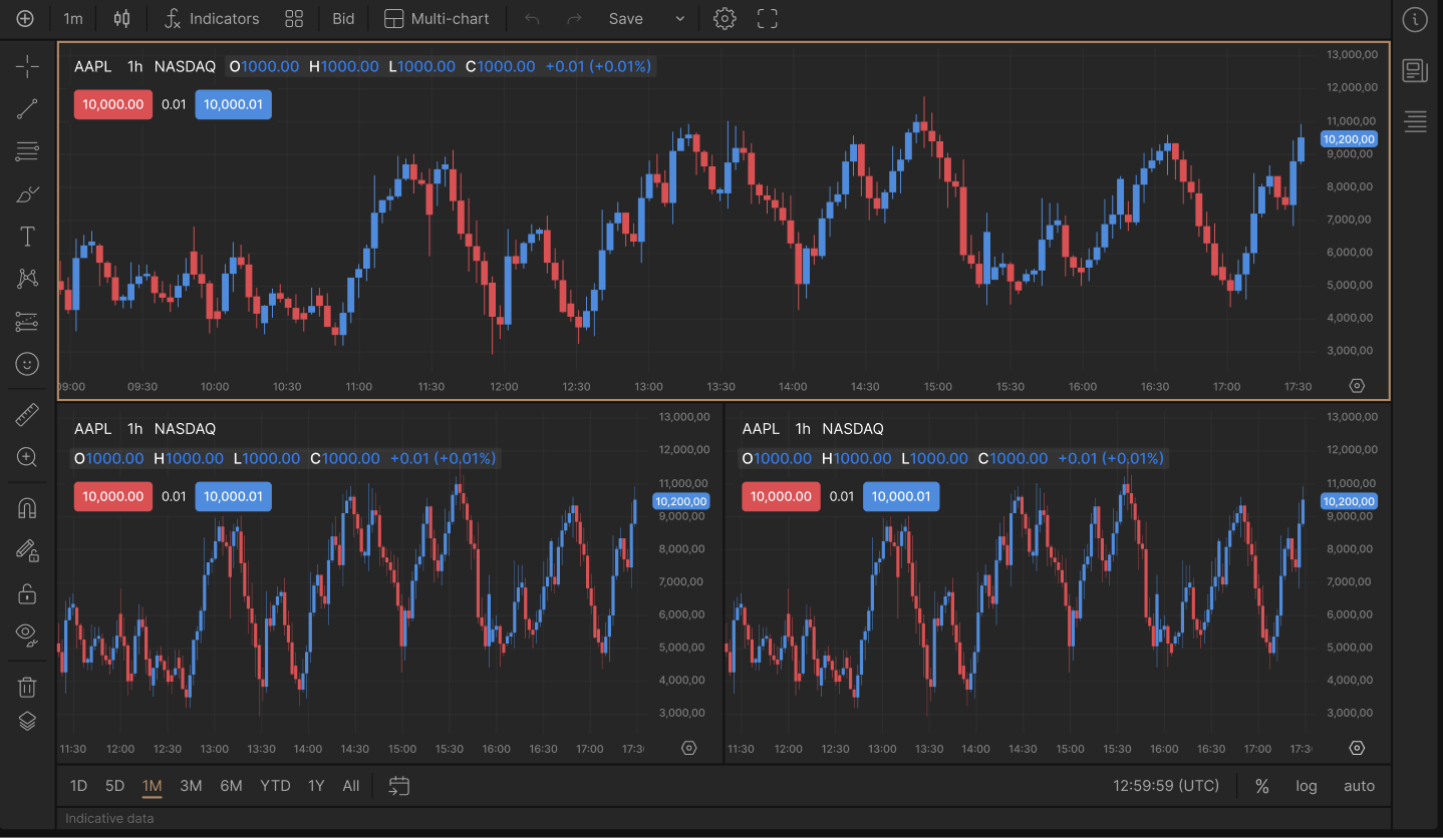 Наши трейдеры давно просили добавить мультиграфик — и теперь он доступен на нашей веб-платформе. Мультиграфик позволяет одновременно просматривать несколько графиков на одном экране, предоставляя вам мощные новые возможности для оптимизации анализа рынка.