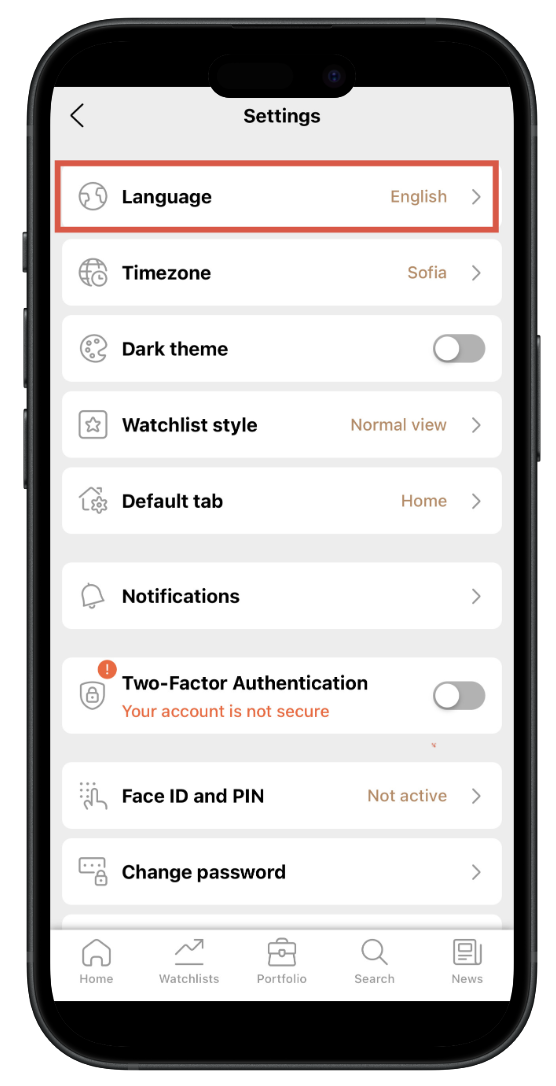 В мобильном приложении просто нажмите на Учетная запись (в верхнем левом углу), перейдите в Настройки, а затем в Язык (первая опция). Нажмите на язык, на который хотите переключиться, а затем нажмите кнопку назад, чтобы сохранить.