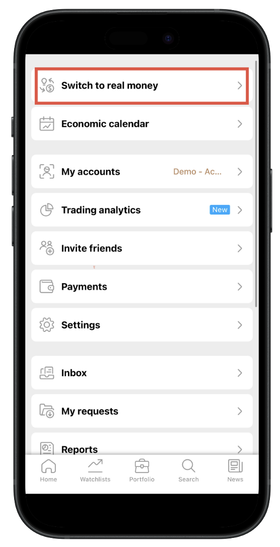 Нажмите «Счет» в левом верхнем углу, затем выберите «Переключиться на демо» или «Переключиться на реальный».